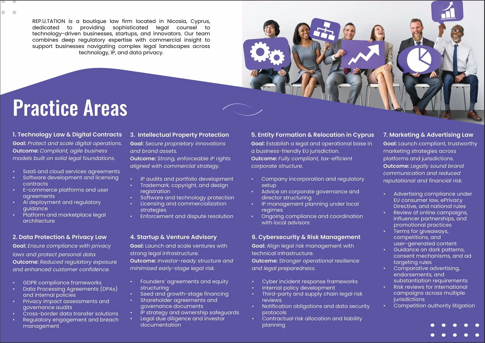 At Rep.U.tation, we bring together the best of two essential worlds: legal protection and brand promotion. In a business landscape where public perception and regulatory compliance go hand in hand, we help you navigate both with clarity and confidence. Our team is made up of legal professionals, data protection experts, and creative brand strategists who work in harmony to ensure your business not only stands out—but stands strong.